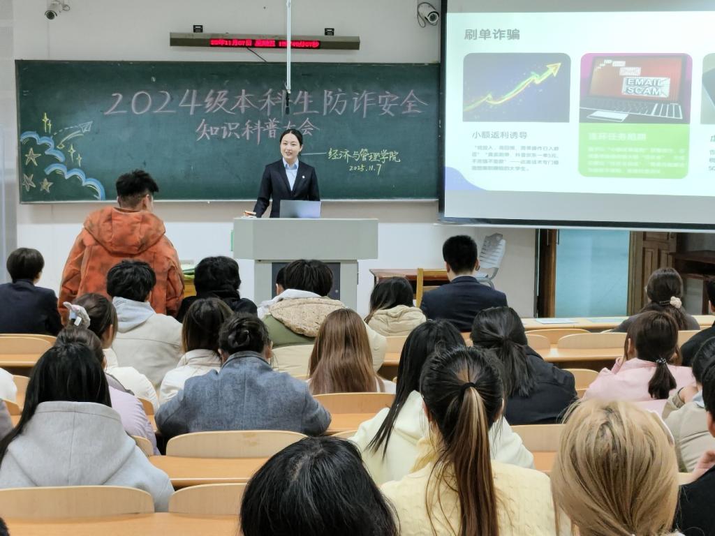 会上,中国建设银行经理马雨晴对大员工职业规划与就业方向选择进行指导。她以“认知金融风险”“典型金融骗局形式”“金融安全识别与规避技巧”等为脉络,结合理财风险、刷单返利、网络贷款等案例拆解常见金融风险逻辑。同时,她现场解答了同学们安全防范及银行从业问题,契合经管学科的素养培育要求,通过与金融行业精英的分享交流,引导学子以金融安全能力为基,锚定报国方向,让金融素养成为践行“化工报国”使命的支撑。