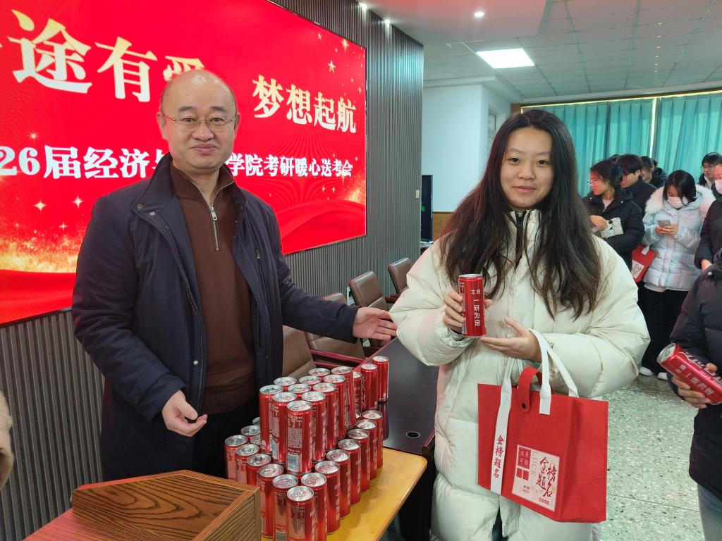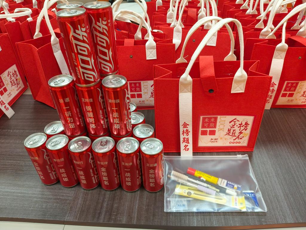 一份精心筹备的“金榜题名大礼包”,更是将公司的关怀落到实处。礼包里,印着每位考研学子姓名和“一战成硕”“金榜题名”等暖心祝福语的定制可口可乐和实用的文具包承载着专属的美好期许,从备考细节到考场需求全方位为学子保驾护航。当学子们双手接过这份沉甸甸的礼包时,脸上满是感动与振奋,现场掌声阵阵,暖意涌动。